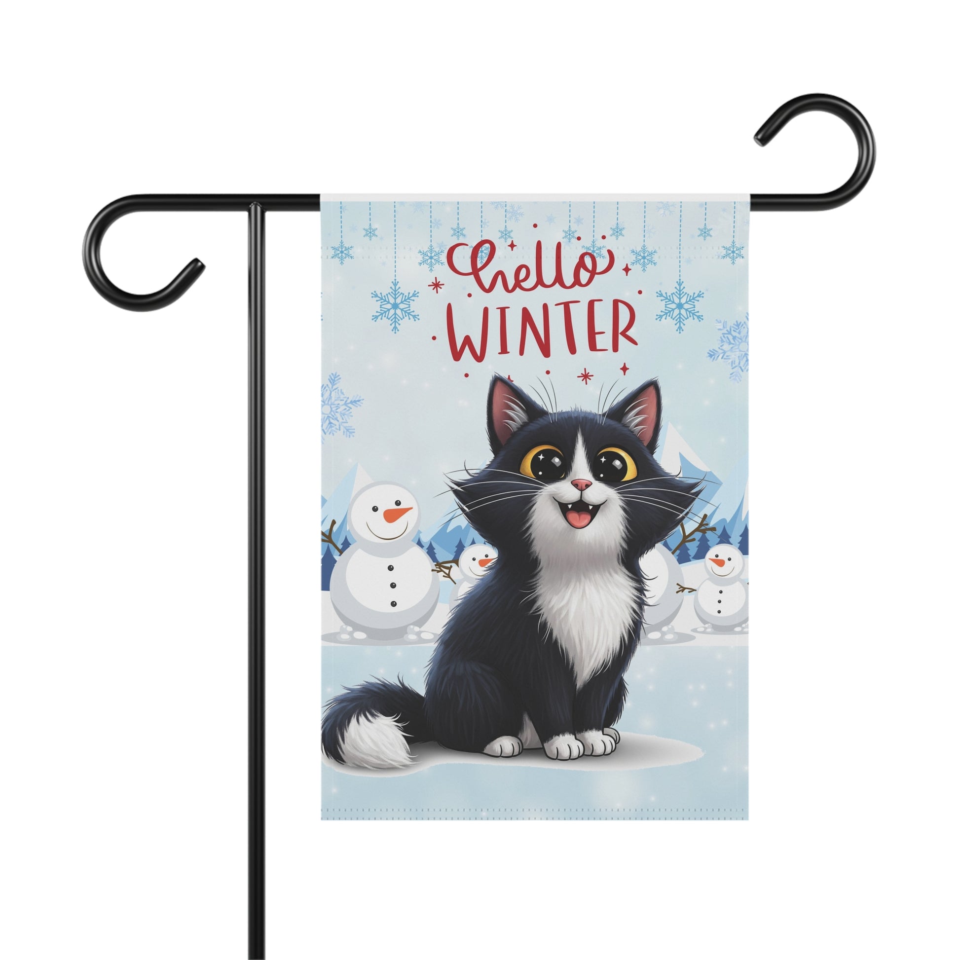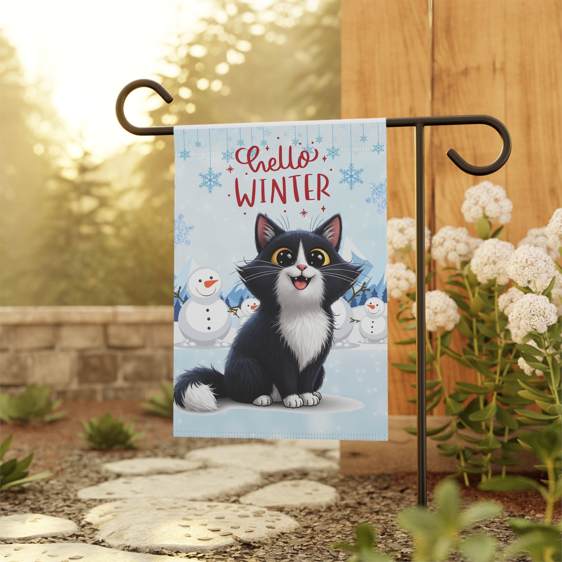 Long hair tuxedo cat Hello Winter Garden Banner